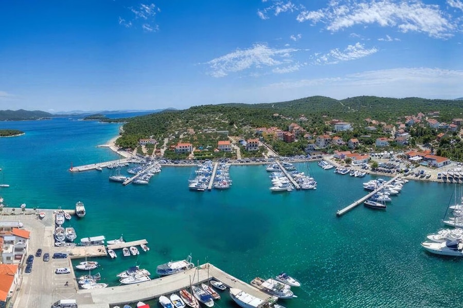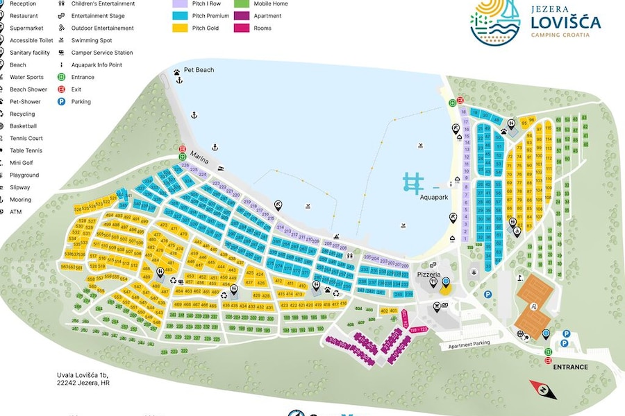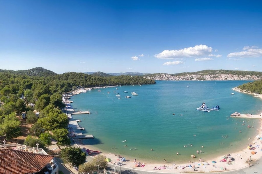 Jezera Lovišća Campsite is located on the natural island of Murter. The island is part of the North Dalmatian Islands and being only 17 km² it is easy to explore on foot or by bike. There are numerous cycling and walking paths that take you past beautiful bays, lush vegetation, picturesque villages and small harbours.If you’re looking for some excitement, plan a visit to the lively town of Murter. You will find plenty of nice restaurants and bars in the attractive centre, making an afternoon of strolling here really worthwhile. You can also visit the magical waterfalls in the impressive Krka Nature Park which is about a 45-minute drive from the campsite.