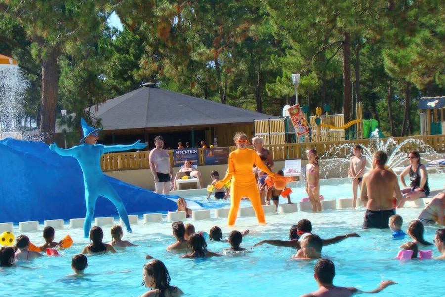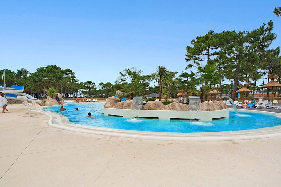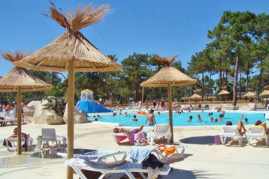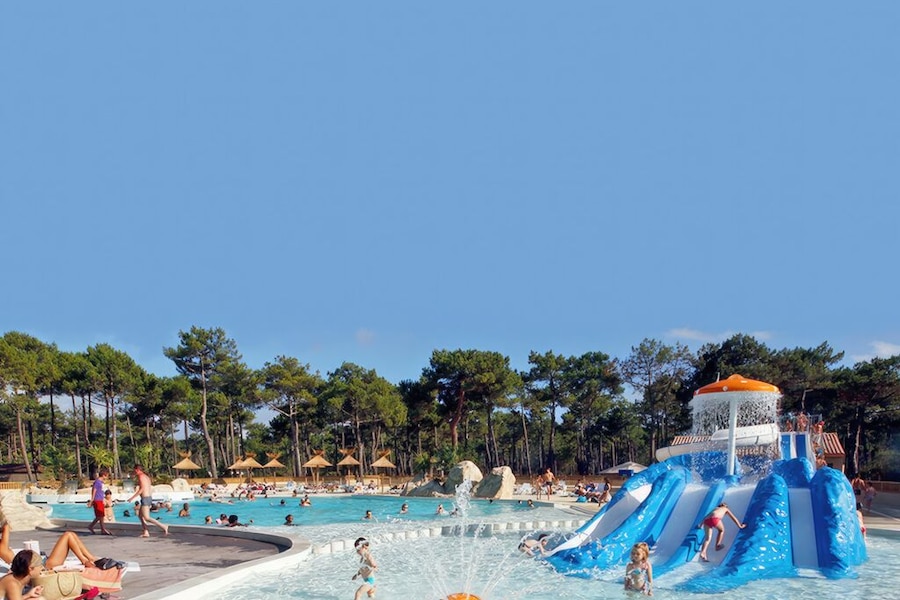 Atlantic Club Montalivet campsite is located about a hundred kilometres northwest of Bordeaux, in the middle of the Médoc. The campsite is located 400 metres from the beach at Montalivet. You can walk from the campsite to the sea through the dunes. Don’t forget to pack your swimming costume because you’re in for a sunny beach holiday! This luxurious French campsite is located in a large pine forest, so you can enjoy the cool shade under trees on even the hottest of days.Race down the slides, swim in a warm pool